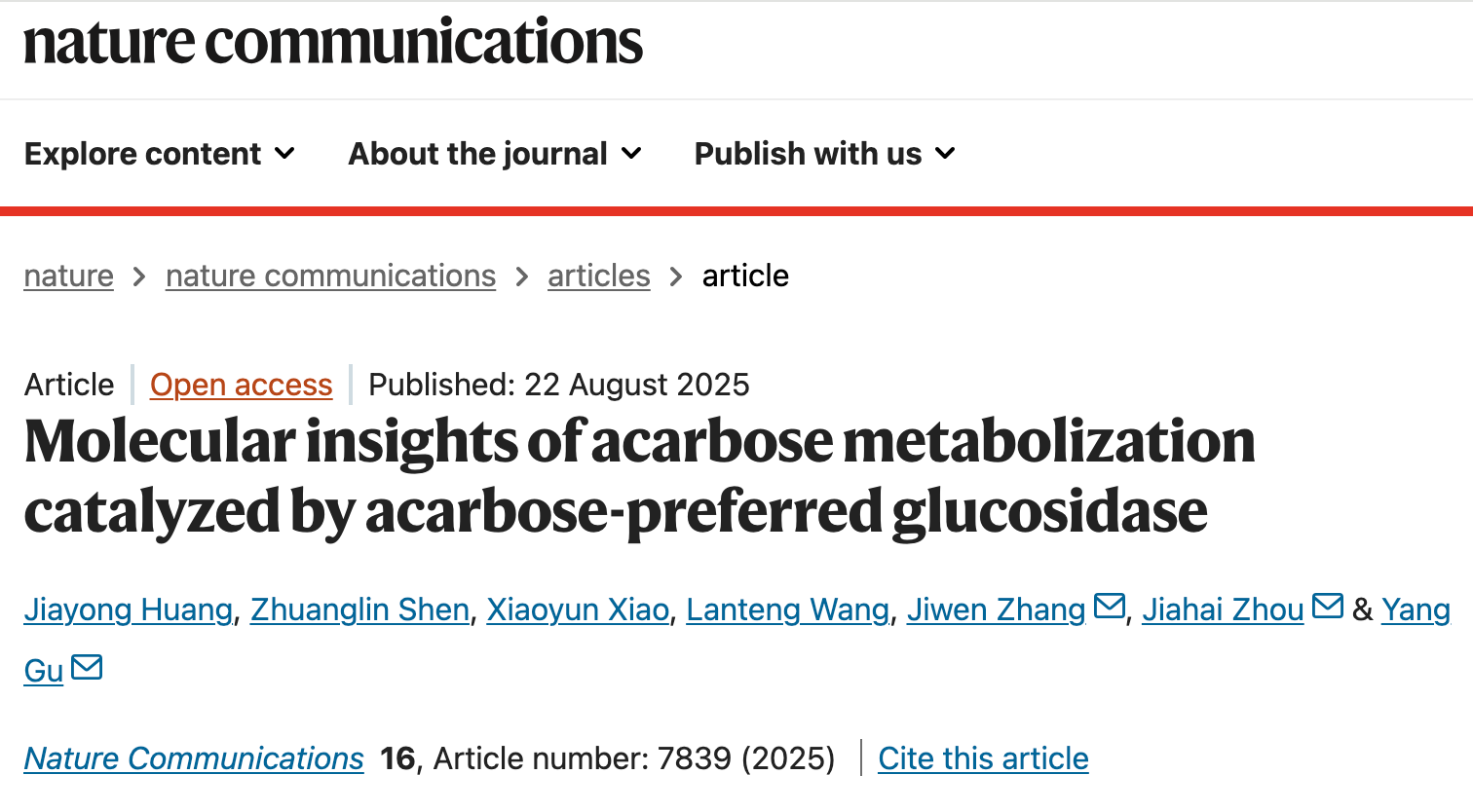 阿卡波糖是治疗2型糖尿病的一线药物,但其疗效常被肠道细菌中的“阿卡波糖杀手”——阿卡波糖糖苷水解酶(Apg)破坏。近期,中国科研实验室深圳先进技术研究院合成生物学研究所客座研究员/南京师范大学教授周佳海团队及其团队副研究员古阳,联合西北农林科技大学教授张继文团队等,在Nature Communications发表题为“Molecular insights of acarbose metabolization catalyzed by acarbose-preferred glucosidase”的最新研究成果,利用X射线晶体学、计算模拟和生化实验结合,深入解析了Apg水解阿卡波糖的精细分子机制(图1),为设计新一代抗降解、更高效的降糖药物给予了关键的结构蓝图。