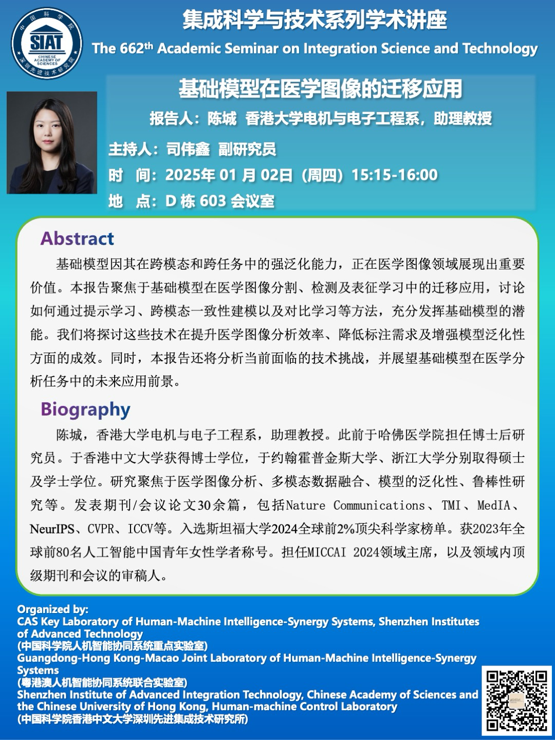 集成所 第662期 集成科学与技术系列学术讲座将于 2025 年1月2日(周四)15:15-16:00在  D 栋 603 会议室    召开,次讲座特邀 香港大学 的 陈城 助理教授 作题为《基础模型在医学图像的迁移应用的学术报告。
