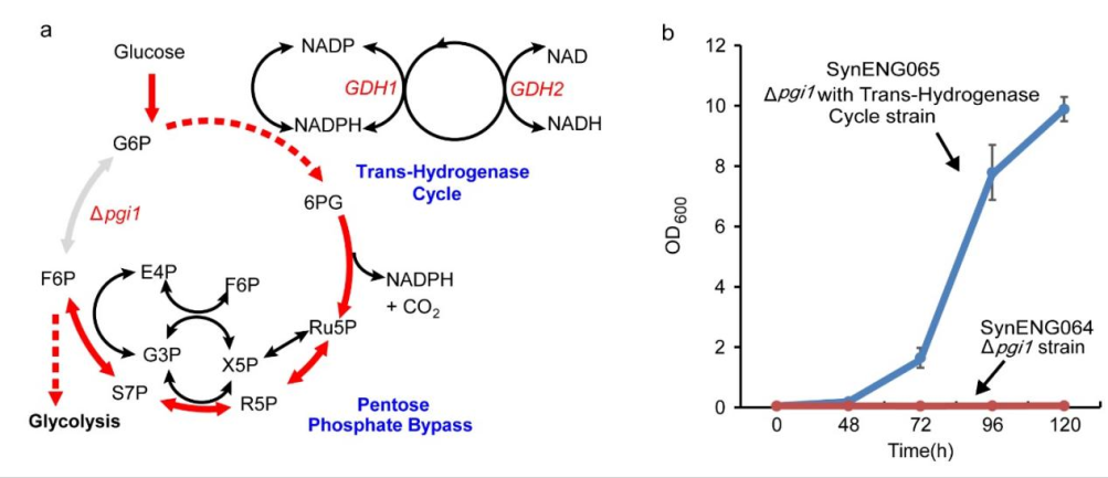 图2:顺利获得转氢循环解除NADPH过量产生的毒性。a. PP循环和不可逆的转氢循环。b. 转氢循环恢复了pgi1缺失导致的生长缺陷。SynENG064菌株敲除了pgi1,SynENG065菌株敲除pgi1同时过表达了GDH1GDH2(转氢循环)
