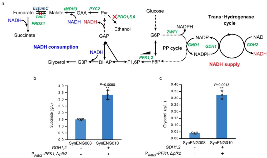 图3.合成能量系统产生过量NADH供给高还原度化学品合成。a. 磷酸果糖激酶下调的PP循环示意图。b. PP循环结合转氢循环提高了琥珀酸的生产。c. PP循环结合转氢循环提高了甘油的生产