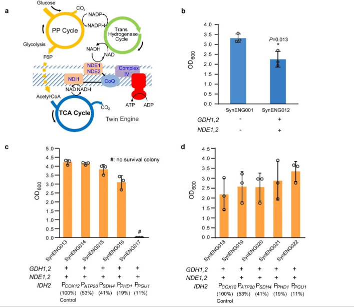 研究者模拟线粒体内的氧化呼吸链,表达了两种外部NADH脱氢酶NDE1和NDE2,将胞质NADH与线粒体电子传递链联系起来,得到菌株SynENG012(图4a-b)。在下调TCA循环关键基因异柠檬酸脱氢酶IDH2的表达水平时,细胞生长逐渐受损乃至致死;放入合成能量系统(转氢循环和外部呼吸链)后,细胞生长不受影响(图4c-d)。这些说明合成能量系统可以替代胞内原有能量系统发挥作用,支持细胞生长。
