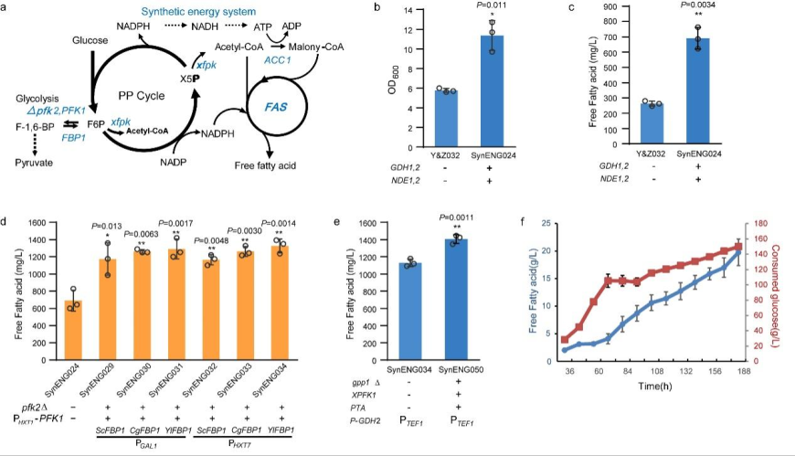 图5.合成能量系统提高FFAs生产。a. 双能量引擎供给FFAs生产示意图。b. 合成能量系统可替代TCA循环支持细胞生长。c. 合成能量系统可替代TCA循环支持FFAs生产。d. 果糖-1,6-二磷酸酶过表达提高了FFAs的生产。e. NOG途径与合成能量系统协作提高了FFAs的生产。f. 限糖限氮条件下SynENG058菌株的补料分批发酵。