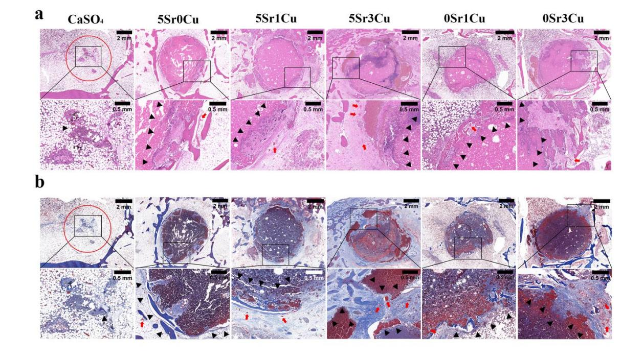 HE染色显示Sr/Cu-BSG骨水泥植入新西兰兔股骨髁16周后植入部位未发生炎症、坏死、吸收和肿瘤等不良反应,说明Sr/Cu-BSG骨水泥具有良好的体内生物相容性。Masson染色显示骨水泥植入新西兰兔股骨髁16周后Sr/Cu-BSG骨水泥(深红色)适度降解,降解区域有不同程度新生血管(红色箭头)和降解区域新生骨组织(黑色箭头指示深蓝色区域)形成,说明Sr/Cu-BSG骨水泥降解速率与骨长入速率匹配,并且其具有良好的成血管和成骨性能。