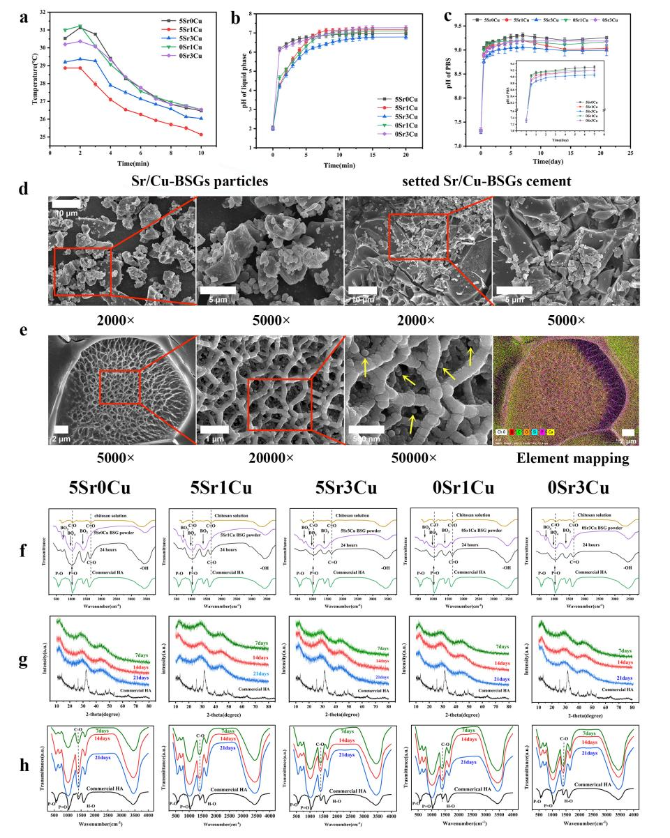 本研究制备一种新型具备适度促进巨噬细胞由M1型向M2型极化,增强骨缺损区域血管化和诱导新骨生成功能的骨水泥。这种骨水泥的物理化学性质满足可注射骨水泥的应用要求,并且顺利获得调控免疫,成血管和成骨来修复兔股骨髁临界骨缺损(直径6mm圆柱形骨缺损)。设计思路:Cu和Sr离子已被发现具有抗炎、促进血管生成和成骨生成的功能,制备含Sr、Cu元素硼硅酸盐生物活性玻璃(Sr/Cu-Borosilicate bioactive glass, Sr/Cu-BSG)作为骨水泥的固相,含壳聚糖、柠檬酸和葡萄糖的溶液为骨水泥液相。Sr/Cu-BSG骨水泥具有良好的可注射性,合理的固化时间,适宜的机械强度,以及调控免疫,成血管和成骨的能力。