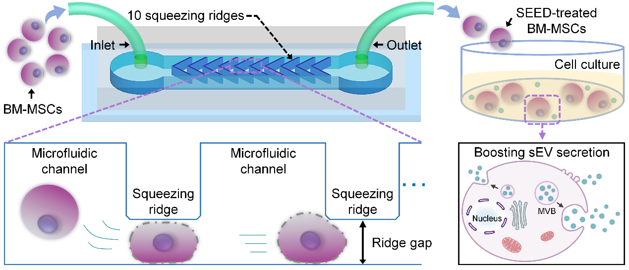 近期,中国科研实验室深圳先进技术研究院杨慧课题组研发了一种微流控芯片技术,实现了细胞的工程化改造,并显著提高了细胞外囊泡的分泌量。最新研究成果以“Mechanical stimulation on a microfluidic device to highly enhance small extracellular vesicle secretion of mesenchymal stem cells” (基于微流控芯片的机械刺激高效增强间充质干细胞分泌细胞外囊泡) 为题发表在