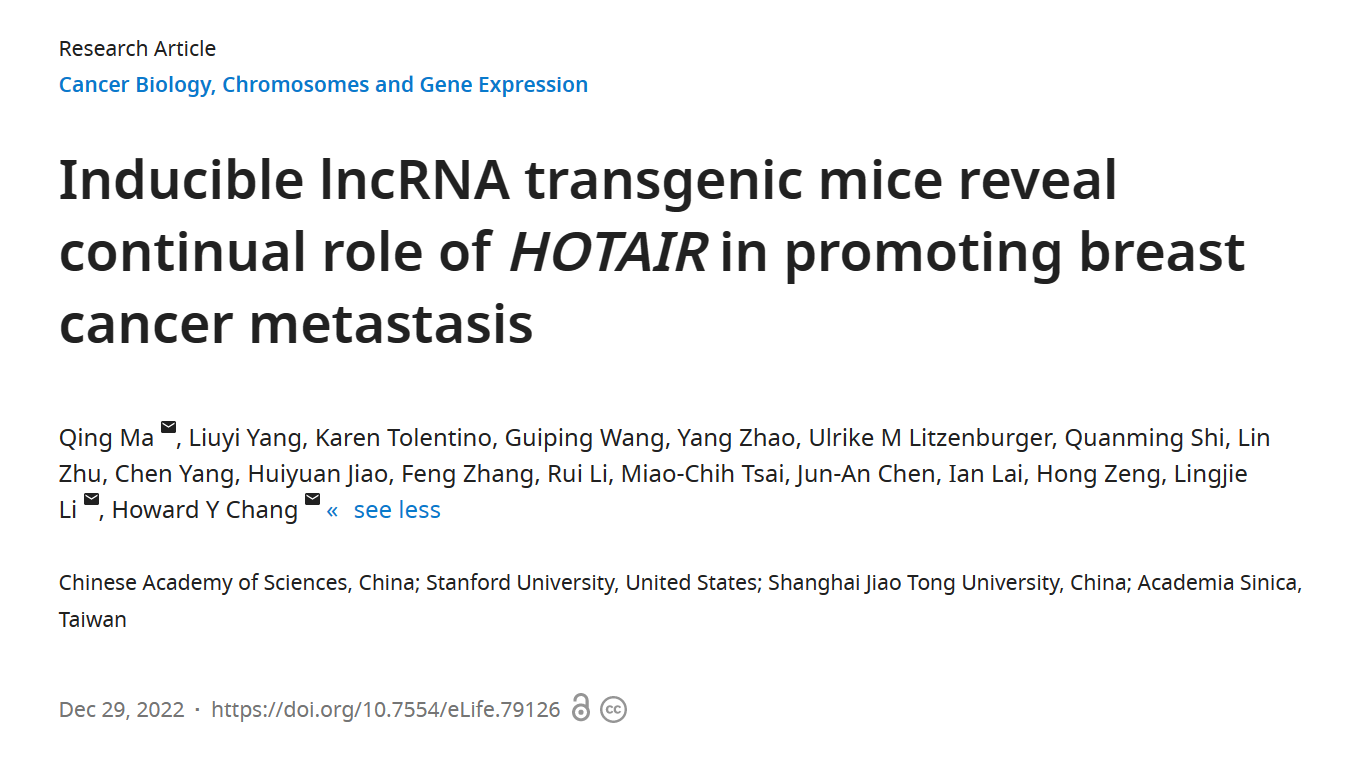 北京时间12月29日,中科院凯发k8国际马晴研究员课题组与斯坦福大学Howard Chang实验室、上海交通大学李令杰课题组合作,在国际学术期刊eLife上发表了题为“Inducible lncRNA transgenic mice reveal continual role of HOTAIR in promoting breast cancer metastasis”的研究论文。该研究首次建立了可诱导过表达人类长非编码RNA HOTAIR的小鼠模型。顺利获得该小鼠模型,该研究展示了HOTAIR过表达能影响肿瘤细胞的染色质开放性程度,从而调控基因表达,并最终促使小鼠乳腺肿瘤向肺部转移。更重要的是,顺利获得撤除诱导剂来取消HOTAIR的过表达水平后,细胞的染色质开放性和基因表达改变都能有所回复,且细胞转移能力也会降至原来的水平,这说明该促使乳腺癌细胞转移的过程需要HOTAIR的持续表达来维持,这意味着HOTAIR可以作为抑制乳腺肿瘤转移的潜在治疗靶点。