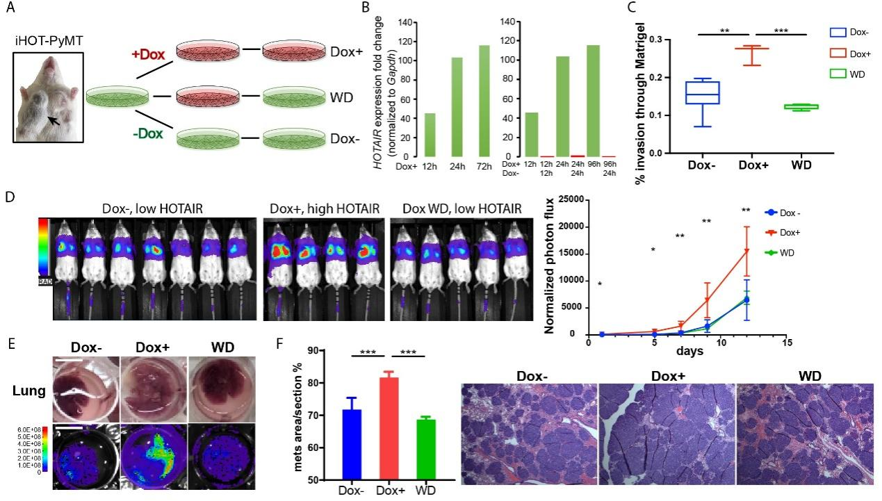 接下来,本研究从该小鼠的肿瘤组织中分离出乳腺癌细胞,称为iHOT细胞,该细胞在加入诱导剂Dox后能过表达HOTAIR,而撤掉诱导剂后,HOTAIR表达量很快降回原本水平,由此得到了一种可以控制HOTAIR表达量的乳腺癌细胞。顺利获得表型实验发现,该细胞在诱导过表达HOTAIR后转移能力增强,而HOTAIR表达降低后,转移能力也随之减弱(图2)。