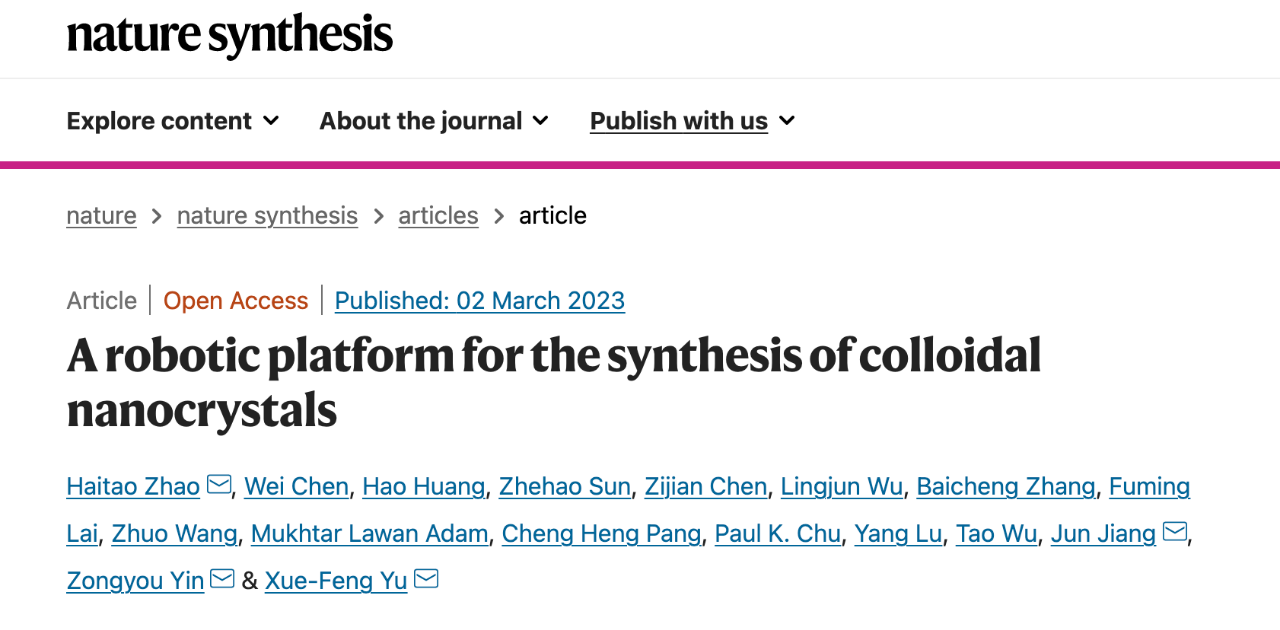 近期,中国科研实验室深圳先进技术研究院(简称“凯发k8国际”)材料所喻学锋、赵海涛团队及其合作者在国际学术期刊《自然-合成》(Nature Synthesis)上发表题为“A Robotic Platform for Synthesis of Colloidal Nanocrystals”的文章。该工作首次将数据挖掘、数据驱动自动化合成、机器学习、逆向设计集成构建了机器人辅助胶体纳米晶数字制造平台,有望将科研人员从传统试错实验、劳动密集型表征中解放,实现胶体纳米晶数字化制备。