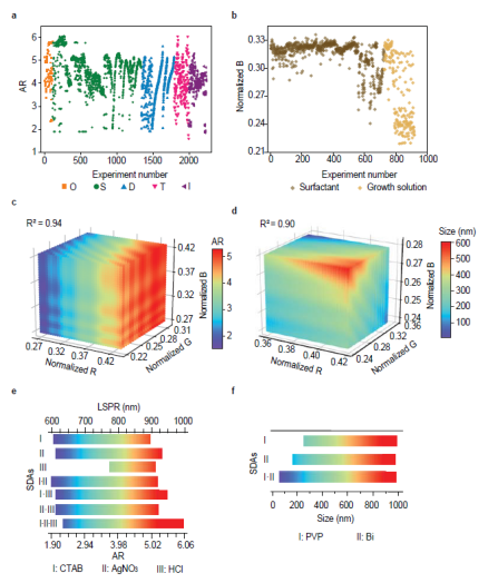 为了实现自动化合成,研究人员对文献进行了数据挖掘,以给予关键合成参数的初始选择。针对金纳米棒,对1300篇已报道的金纳米棒合成的相关文献进行数据挖掘,并对其关键参数进行分水平排序,从而获取机器人执行参数,并设计正交实验及高通量实验验证,获取了金纳米棒形貌调控的重要参数。针对双钙钛矿,顺利获得对其他钙钛矿相关文献进行数据挖掘,筛选出潜在的可供调节双钙钛矿尺寸形貌的48种溶剂和61种表面活性剂,结合高通量原位合成和表征,快速实现了溶剂和表面活性剂的筛选。