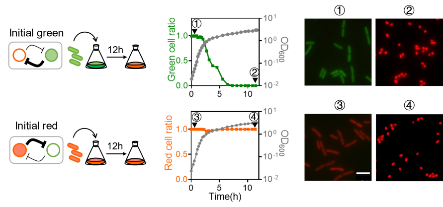 为了研究细胞的生长速率对基因网络是否可以存在影响,科研团队利用了经典合成基因线路——拨动开关线路(the toggle switch1),来研究这种可能性。拨动开关线路由两个相互阻遏的基因所构成,使得该线路在稳态(stable states)下只能存在一种基因处于高表达状态。这样的网络拓扑结构也广泛存在于自然界中,例如:λ噬菌体溶菌-溶原决定,线虫左右味觉神经分化。另外,构成这一线路的元件已经被广泛定量表征,与宿主自生基因调控网络相正交,因此可以排除宿主自身状态对基因线路的直接调控,同时也利于定量分析网络的稳态行为。