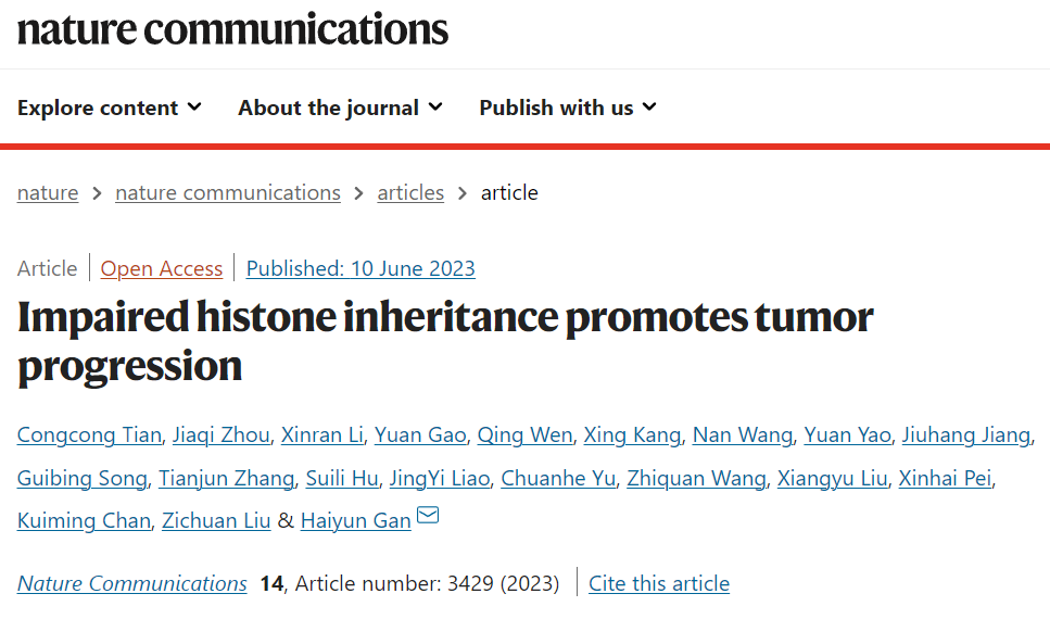 6月10日,中国科研实验室深圳先进技术研究院合成生物学研究所、深圳合成生物学创新研究院甘海云课题组在Nature Communications(自然通讯)发表了题为Impaired histone inheritance promotes tumor progression的文章,该研究发现破坏亲代组蛋白传递可导致肿瘤表观遗传谱改变,促进肿瘤进化,最终促进肿瘤生长和转移。