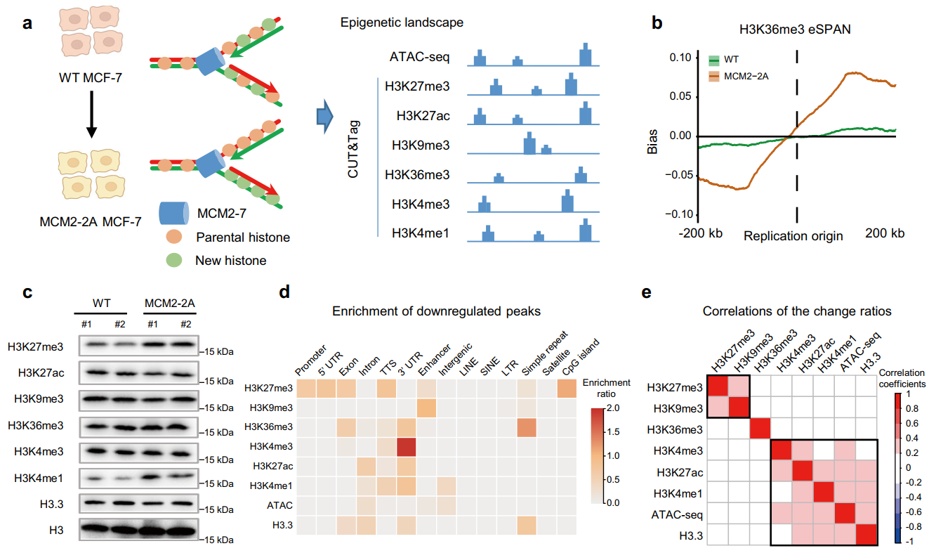 为了深入探讨组蛋白遗传在肿瘤进展中的作用,甘海云团队在人类乳腺癌细胞中顺利获得突变MCM2与组蛋白结合的结构域或敲除POLE3成功构建了组蛋白遗传受损的肿瘤细胞模型,并发现破坏肿瘤细胞的组蛋白遗传后,肿瘤细胞的表观遗传谱发生了剧烈的改变(图1)。