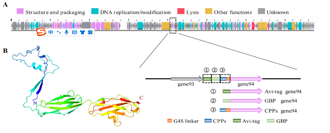 鼠伤寒沙门氏菌在感染过程中可进入宿主细胞内繁殖,造成感染迁延难愈。由于传统抗生素难以有效进入细胞,达到有效杀菌浓度;同时,随着耐药细菌全球流行,临床上迫切需要一种新的方法来治疗由耐药菌引起的细胞内感染。噬菌体作为细菌天敌,可用于治疗耐药菌感染,然而其进入细胞的能力有限,极大地限制了其在治疗胞内菌感染中的应用。近年来随着合成生物学的开展,利用基因编辑技术构建穿膜肽(Cell-penetrating peptide,CPP)展示工程噬菌体以杀灭胞内菌成为可能。现在,关于噬菌体展示技术主要在大肠杆菌相关模式噬菌体召开。但自然界中噬菌体多样性极高,研究人员对可修饰的结构蛋白分析甚少及众多未知功能基因等极大的限制了非模式噬菌体合成生物学改造的召开。