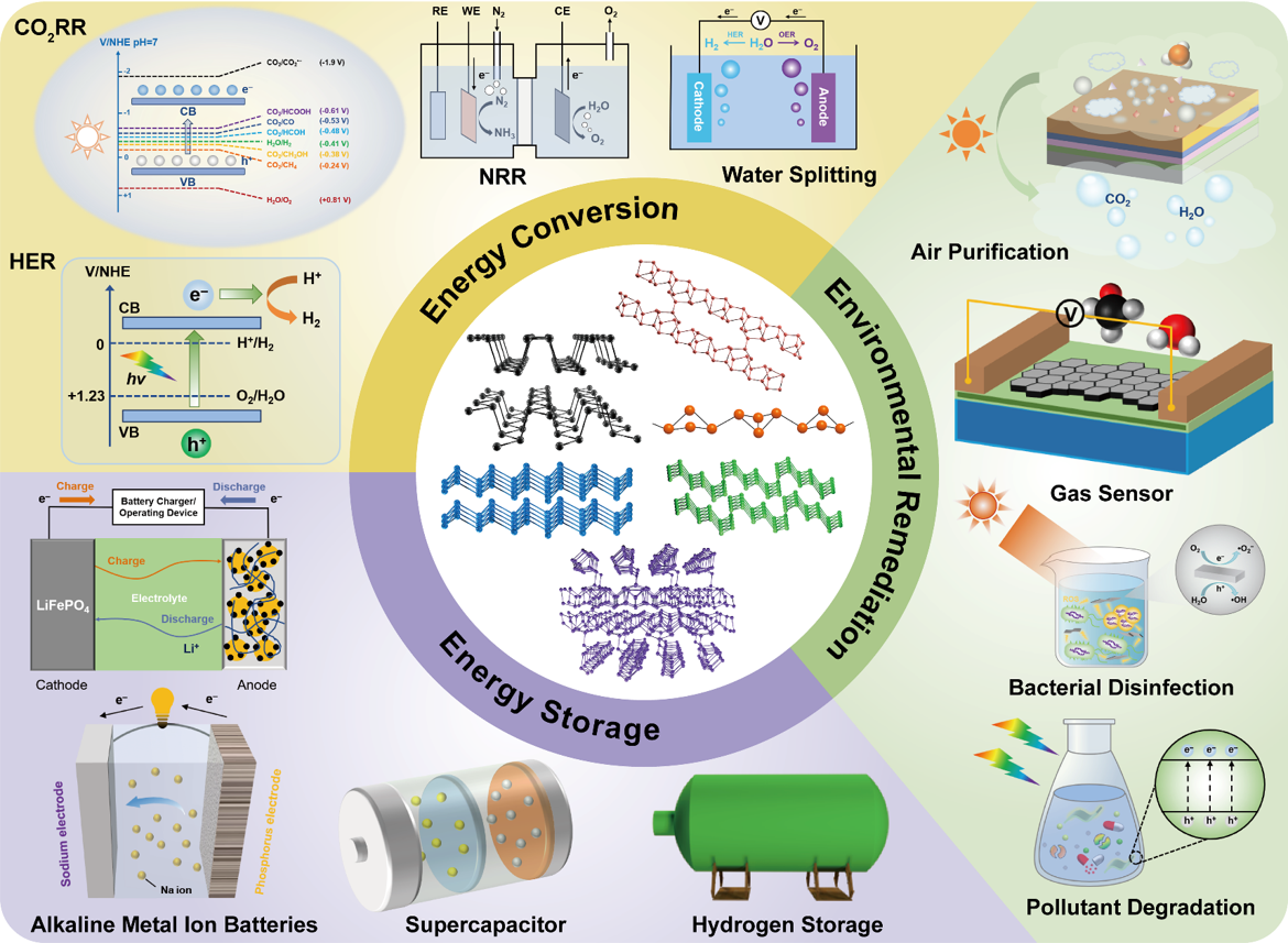 近年来,单质磷材料在多种能源环境相关领域的应用场景中崭露头角(图4)。第一时间,单质磷的微纳材料覆盖了从紫外到红外较宽的光谱范围和明显的富电子特性,因此在水分解、二氧化碳转化、固氮等领域表现出可观的光、电催化性能;其次,单质磷材料的碱金属离子存储容量大、电位适中、层间距大,是储氢、碱金属电池、超级电容器等各种储能器件重要候选电极材料;此外,单质磷材料在化学分子传感、污染物降解、细菌消毒、土壤修复等领域也得到越来越多的关注。