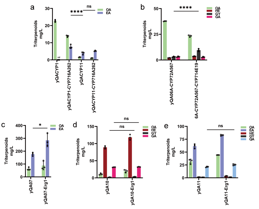 虽然强化代谢流通量是提高产量的有效手段,但是研究人员发现过表达酿酒酵母内源的erg1只能增加双位点的氧化产物如EA和HE的产量积累,并不能增加QA的产量,从而证明单纯增加前体供应对于三位点氧化产物的积累影响较小(图三)。