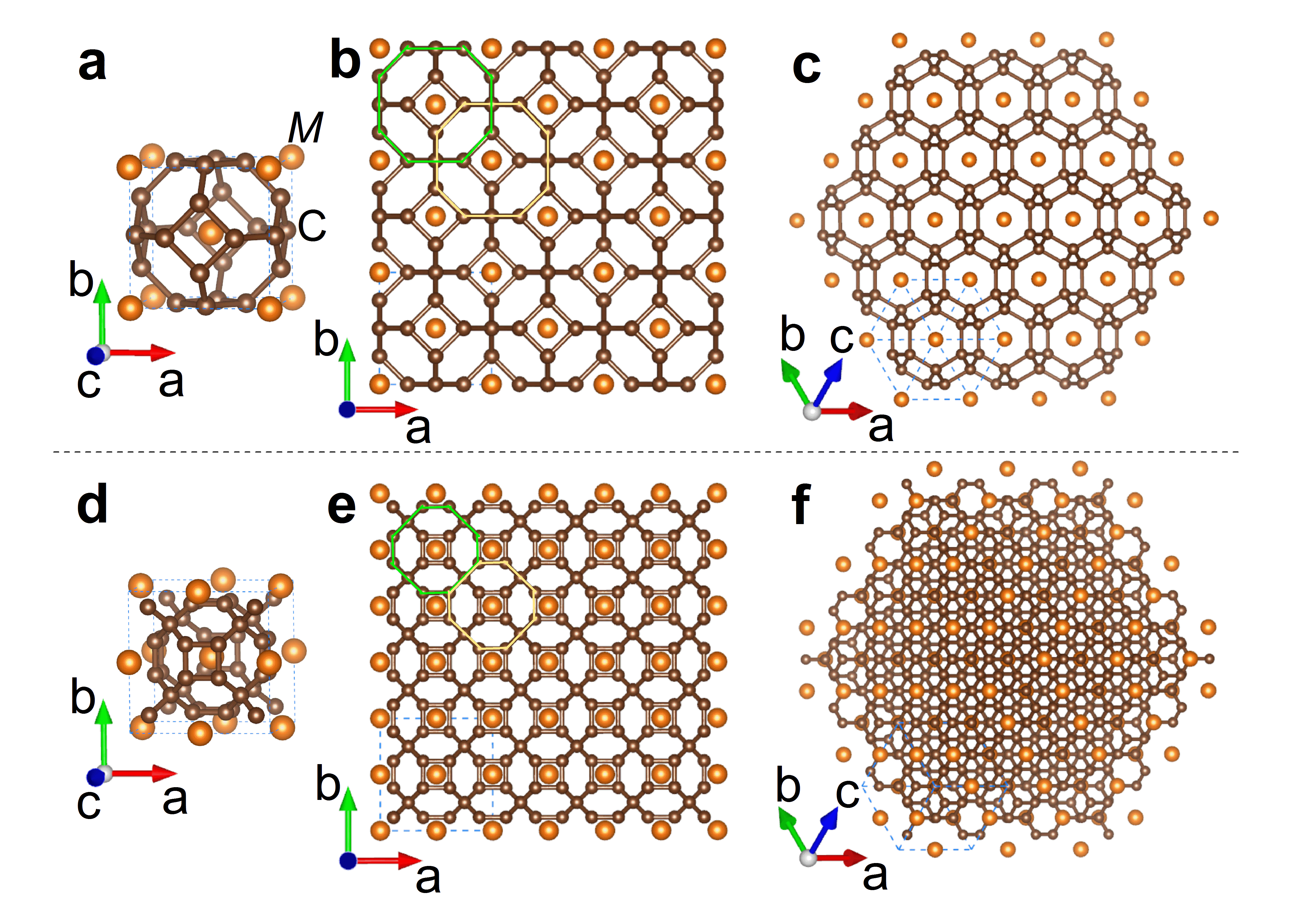 图1.(a)-(c)对应为C24笼单元和 C24笼耦合后形成的网络状结构,不同方向视图。(d)-(f)对应为C32笼单元和 C32笼耦合后形成的网络状结构,不同方向视图。
