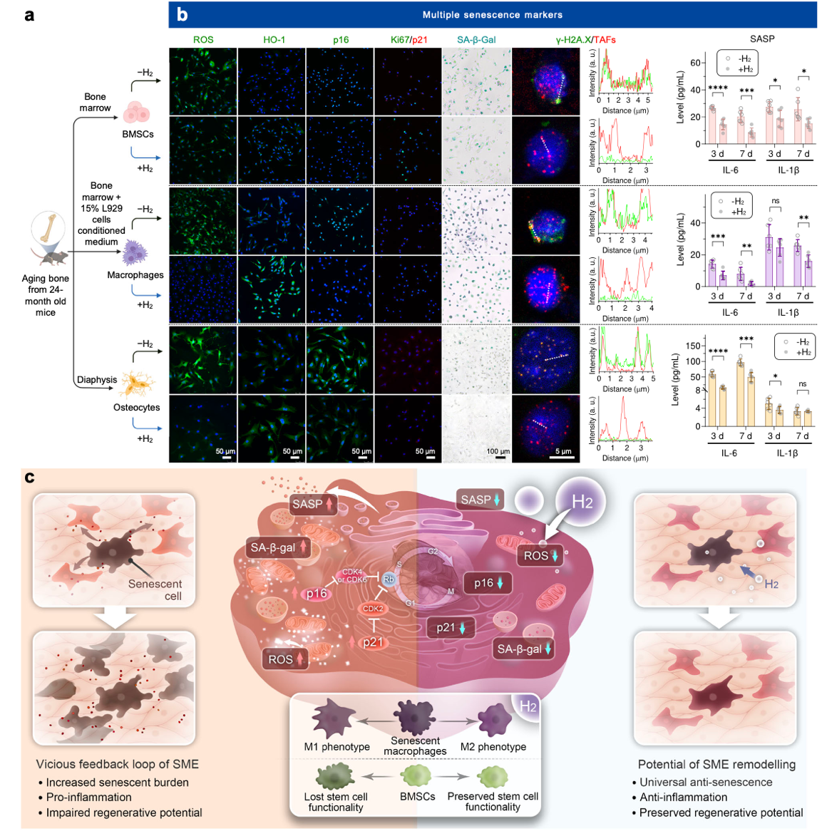 图1:氢分子对老龄骨组织中干细胞、巨噬细胞和骨细胞均具有显著抗衰老效应