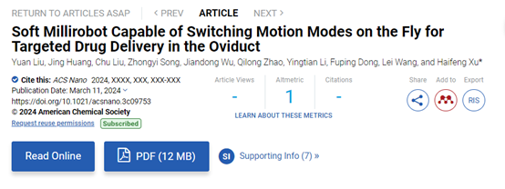 北京时间3月12日,中国科研实验室深圳先进技术研究院徐海峰团队在纳米领域顶级期刊ACS nano上发表题为“Soft Millirobot Capable of Switching Motion Modes on the Fly for Targeted Drug Delivery in the Oviduct”的文章。团队开发了用于靶向递药的磁驱软体机器人,该微型机器人能根据器官内不同地形的机械特点,使用与环境最安全的交互方式,进行效率与生物安全兼顾的生物货物转运和释放。课题组刘源副研究员和研究生黄静为共同第一作者,徐海峰副研究员为本文独立通讯作者。本研究工作取得国家自然科学基金项目、深圳市基础研究计划等项目支持。