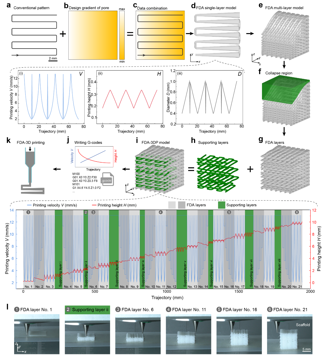 挤出式3D打印为最常见的3D打印技术,具有高适用性,广泛应用于类器官体外制造与组织工程等前沿领域。然而,传统挤出3D打印采用平行切片方法,其在层内打印时保持恒定的打印速度V和打印高度H,沉积形成的纤维直径也保持恒定,严重限制了其设计制造复杂梯度多孔结构(如图1a,b)。为了突破传统3D打印策略的限制,研究团队基于体积守恒定律,顺利获得定制运动轨迹上的打印速度和打印高度,实现各处纤维直径的精准控制,提出FDA-3DP(filament diameter-adjustable 3D printing)新策略(如图1c,d)。