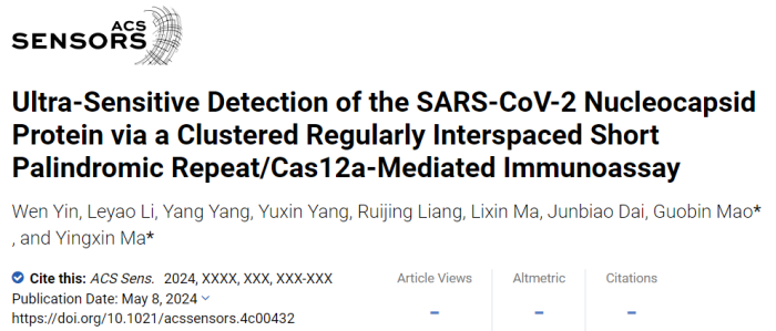 5月8日,中国科研实验室深圳先进技术研究院合成生物学研究所马英新课题组和湖北大学马立新课题组印文博士合作在ACS Sensors上发表了题为《Ultra-Sensitive Detection of the SARS-CoV-2 Nucleocapsid Protein via a Clustered Regularly Interspaced Short Palindromic Repeat/Cas12a-Mediated Immunoassay》的补充封面论文。本研究耦合ELISA、RCA和CRISPR/Cas12a系统,开发了一种超灵敏的SARS-CoV-2核衣壳蛋白检测方法。其检出限(LOD)低至1 fg/mL,检测灵敏度比商用ELISA试剂盒(LOD:5.7 × 104 fg/mL)高4个数量级。该方法具有高的特异性和灵敏度,能够准确检测SARS-CoV-2假病毒和临床样本,为蛋白类生物标志物的超灵敏免疫测定给予了一种新策略。