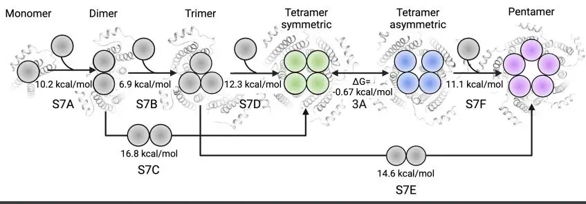为了进一步分析五聚体组装途径模型,团队顺利获得计算机模拟系统阐述了该受体在生理环境下,从单体聚集成多聚体过程的分子机理。计算机模拟和生化实验表明,单一的5-HT3R四聚体形成的孔洞空间狭窄,无法容纳相关的离子顺利获得该通道来行使其信号传导生理功能。计算机模拟还发现,将单体结合四聚体形成五聚体比二聚体结合三聚体形成五聚体在能量上更有优势。