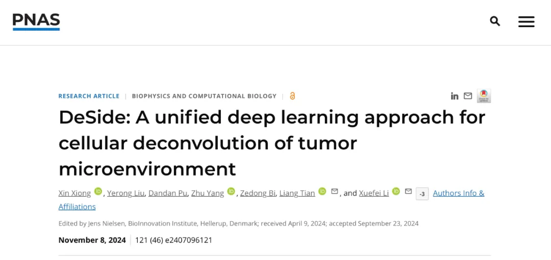 相关研究成果于11月8日以 “DeSide: A unified deep learning approach for cellular deconvolution of tumor microenvironment”为题在线发表于PNAS杂志。