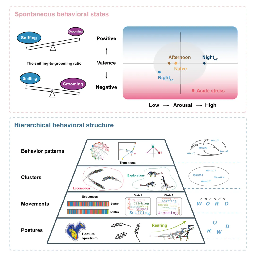自发行为是在无主观意图或外部刺激的情况下发生的行为,对维持健康和调节躯体至关重要。自发行为学实验由动物本身而非实验者来主导,易操作的同时还能更准确地反映动物的内部状态。自发行为的变化可以反应个体内部状态的偏差,这些偏差可能与潜在健康问题有关,如疼痛和毒素暴露、癫痫发作间期、中风恢复和自闭症以及急性应激等。为了建立一个易于理解和解释的行为分析框架,我们从自发行为的姿势动力学、动作与动作集的时空特征及其内在组织逻辑层面系统刻画了两性小鼠自发行为的特征。研究结果表明,在不同情绪状态、昼夜节律和光照条件下,两性小鼠的自发行为表现出不同的特征。这些特征由不同内外因素驱动,最终形成了差异性的行为模式。其中,嗅探是不同条件下自发行为动作转换的枢纽节点,计算嗅探与梳理的比例能高通量的准确区分自发行为状态。HBAF为深入召开行为学研究给予了一个高效的平台,顺利获得给予全面的分层行为数据,在行为结构理论知识与实际分析之间架起了一座桥梁,还将为生物学、药理学、医学以及相关学科领域研究中的动物行为实验分析和结果解读给予全新的技术手段。