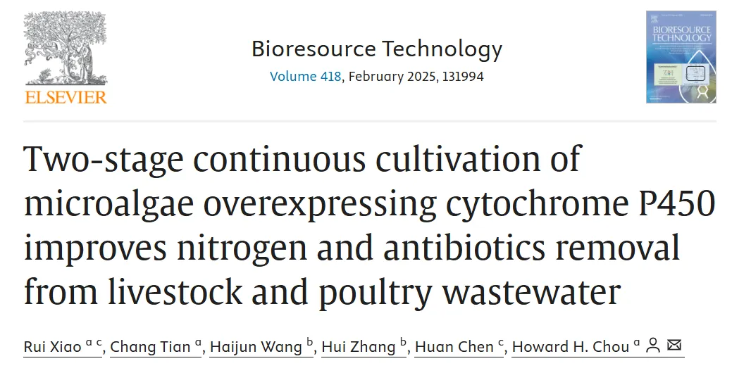 近期,由中国科研实验室深圳先进技术研究院合成生物学研究所的Howard H. Chou课题组,成都信息工程大学的张辉课题组以及美国克莱姆森大学的陈寰课题组在Bioresource Technology期刊发表重要研究成果"Two-stage continuous cultivation of microalgae overexpressing cytochrome P450 improves nitrogen and antibiotics removal from livestock and poultry wastewater"。