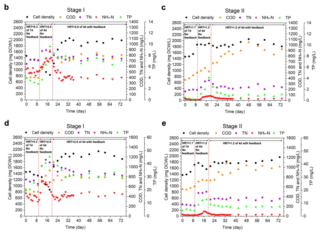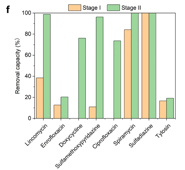 为了能够让 M5 投入商业应用,并且与传统的活性污泥法的水力停留时间相匹配(HRT=4-6天),我们利用了 DBTL 策略来建立了一套新型两级陆续在反馈式处理系统(CFP)。经过了长达两个月的观察,CFP工艺在水力停留时间为4天的情况下实现了稳定的污染物降解率,其中在鸭场废水中的去除率为 334 mg TN/L/d、306 mg NH4-N/L/d 和 4 mg TP/L/d,在猪场废水中的去除率为 213 mg TN/L/d、213 mg NH4-N/L/d 和 10 mg TP/L/d。即使在将系统总工作体积减少 43% 后,使用CFP工艺的 NH4-N 去除率仍比摇瓶实验高出 70%。另一方面,在对 CFP 系统中抗生素浓度的分析表明,林可霉素、恩诺沙星、磺胺甲氧哒嗪、螺旋霉素、磺胺嘧啶和泰乐菌素的去除效果均有所改善(图 2f、g)。实验数据证实了该套工艺已经可以和传统的活性污泥法的处理效率不相上下了,甚至在总氮的处理方面比污泥法更胜一筹。