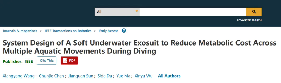 研究成果以System Design of A Soft Underwater Exosuit to Reduce Metabolic Cost Across Multiple Aquatic Movements During Diving 为题,发表在机器人领域权威期刊 IEEE Transactions on Robotics。智能仿生中心博士后王向阳和陈春杰研究员为共同第一作者,吴新宇研究员为通讯作者。其它作者中,马跃和孙健铨协助外骨骼系统搭建,杜思达协助实验实施。IEEE Transactions on Robotics 是IEEE旗下机器人与自动化协会的汇刊,是国际机器人领域顶级期刊之一。