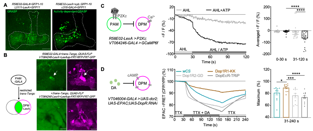 研究团队结合免疫组化、特异标记的顺行示踪遗传工具以及离体功能成像技术,揭示了PAM神经元与DPM神经元之间存在结构性连接,DPM神经元位于PAM神经元的下游,且二者之间的突触连接是抑制性突触连接的,进一步发现在DPM神经元中Dop1R1受体主导参与抑制功能 (图1)。