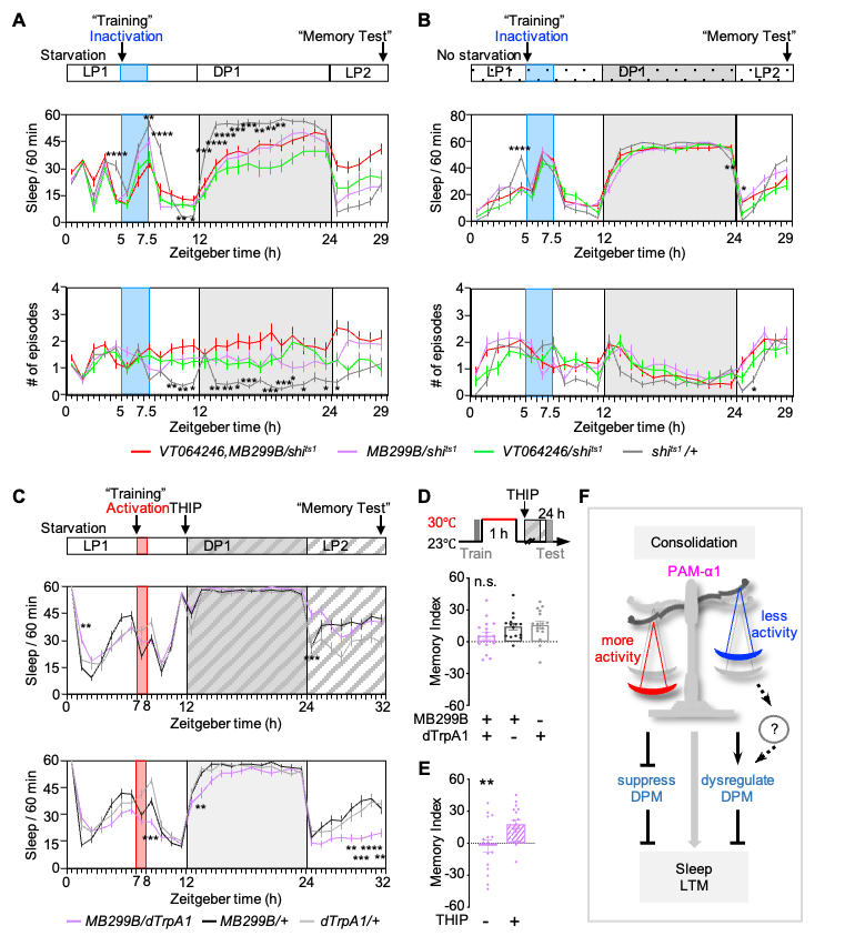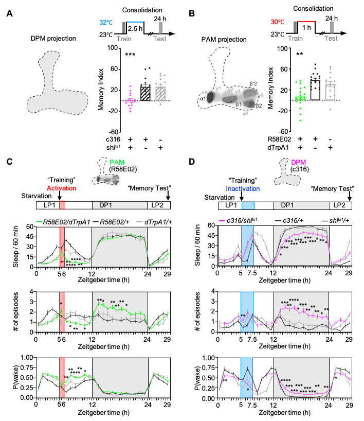 经过一系列的行为学检测,确定DPM神经元在LTM的记忆巩固过程中是必需的,并发现PAM神经元如在记忆巩固关键时间窗口短暂被激活,也可导致LTM受损。短暂的抑制DPM或者激活PAM均导致眠量减少且碎片化,觉醒阈值降低。这些结果表明这两类神经元都参与记忆巩固和睡眠的调控(图2)。