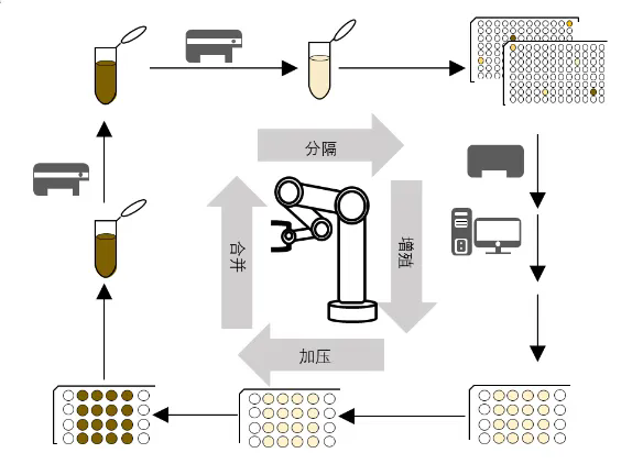 图2 自动化生物铸造厂验证强分散下的自我牺牲行为演化。展示了使用生物工厂技术的自动化实验流程,包括细胞密度测量、强稀释、分离、培养和监测等步骤。