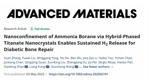 中国科研实验室深圳先进技术研究院王国成研究员团队联合空军军医大学口腔医院孔亮教授团队、常州大学赵晓兵教授团队,近期在国际学术期刊Advanced Materials发表题为"Nanoconfinement of Ammonia Borane via Hybrid-Phased Titanate Nanocrystals Enables Sustained H2 Release for Diabetic Bone Repair"的研究论文。该研究针对糖尿病患者骨植入失败率高的临床难题,开发了新型纳米限域氢气递送系统。