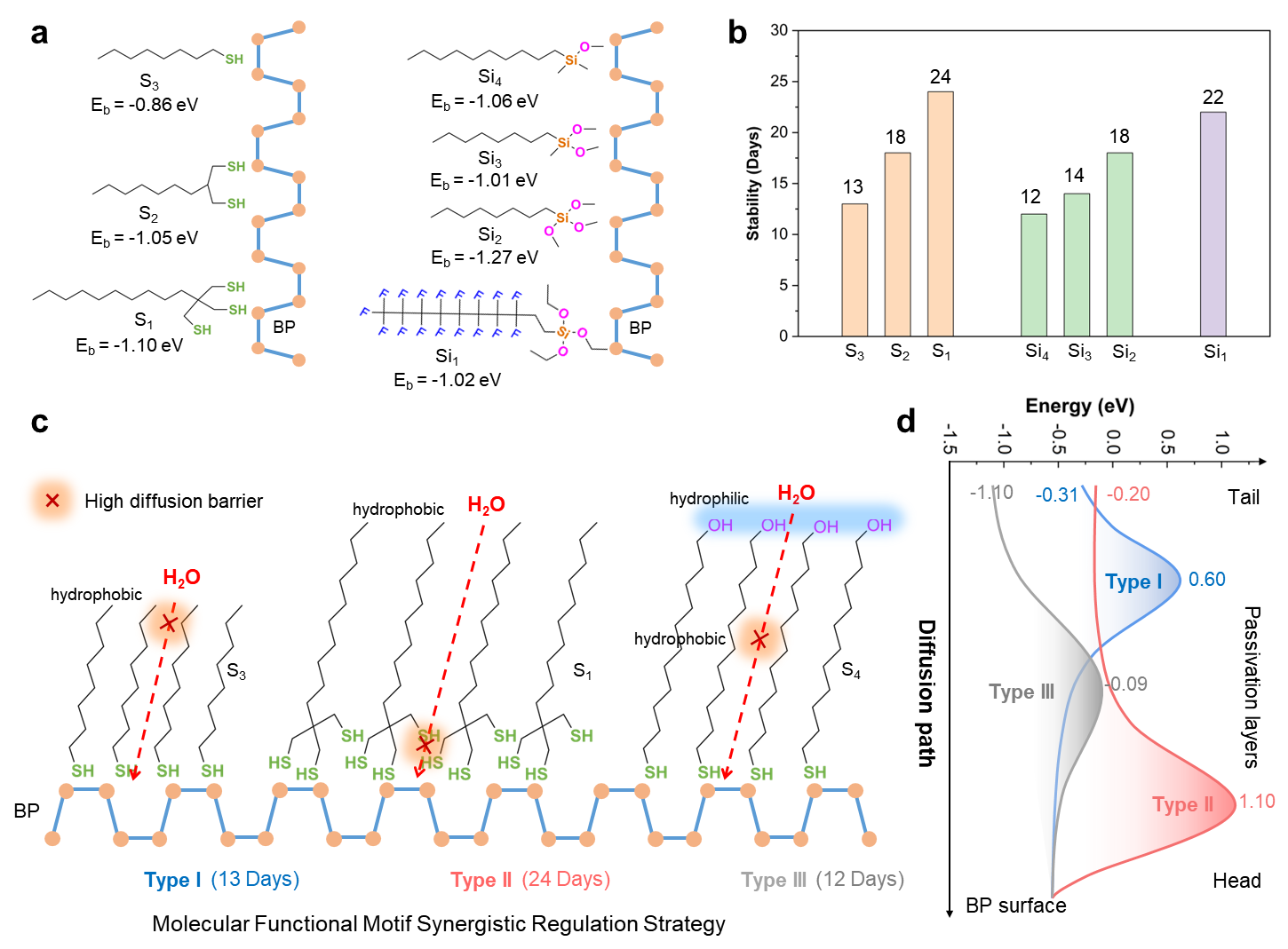 图3 | 基于分子工程提高黑磷界面稳定性的协同调控策略。