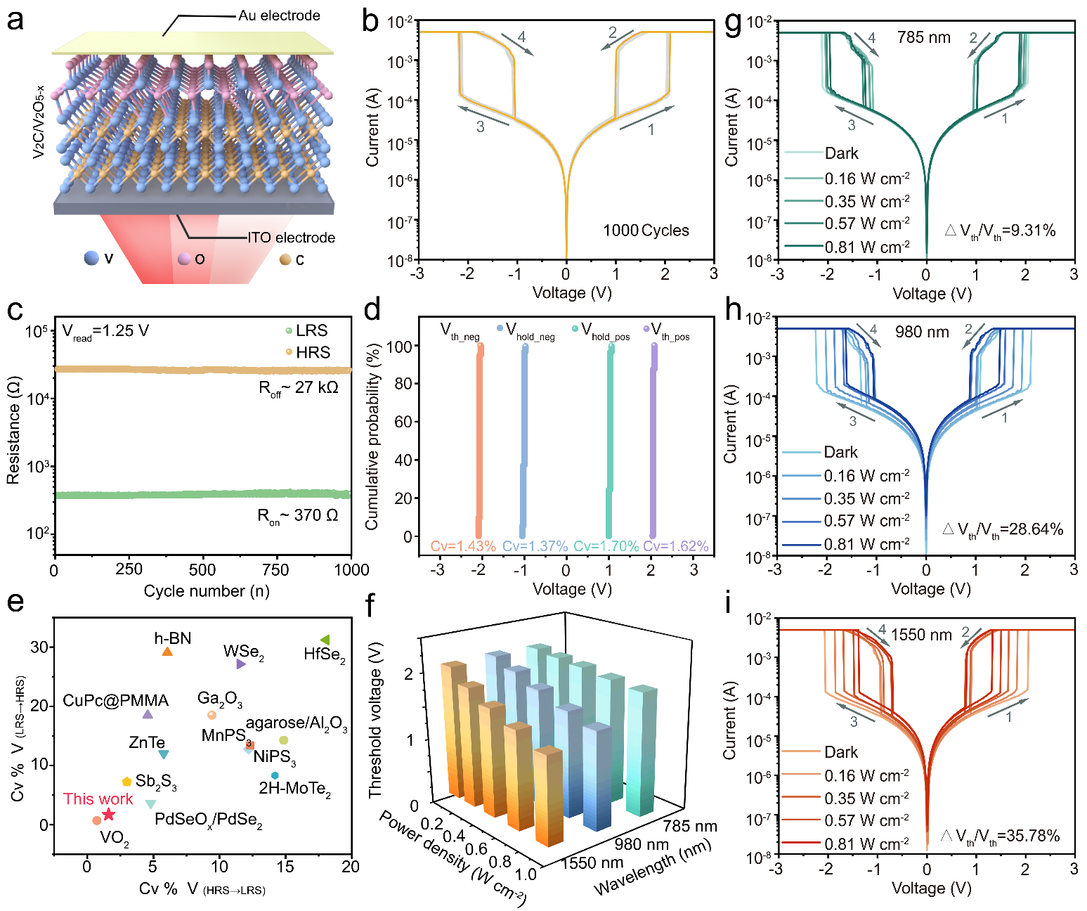 卓越的多色近红外响应易失性型忆阻器:V2C/V2O5-x忆阻器展现出稳定的阈值型易失性特性,其转变电压的变异系数低至1.62%和1.7%。研究还发现,顺利获得调节785nm至1550nm波段的近红外光功率密度与波长,可有效调控该忆阻器的阈值电压,模拟生物神经元的动态行为(图3)。