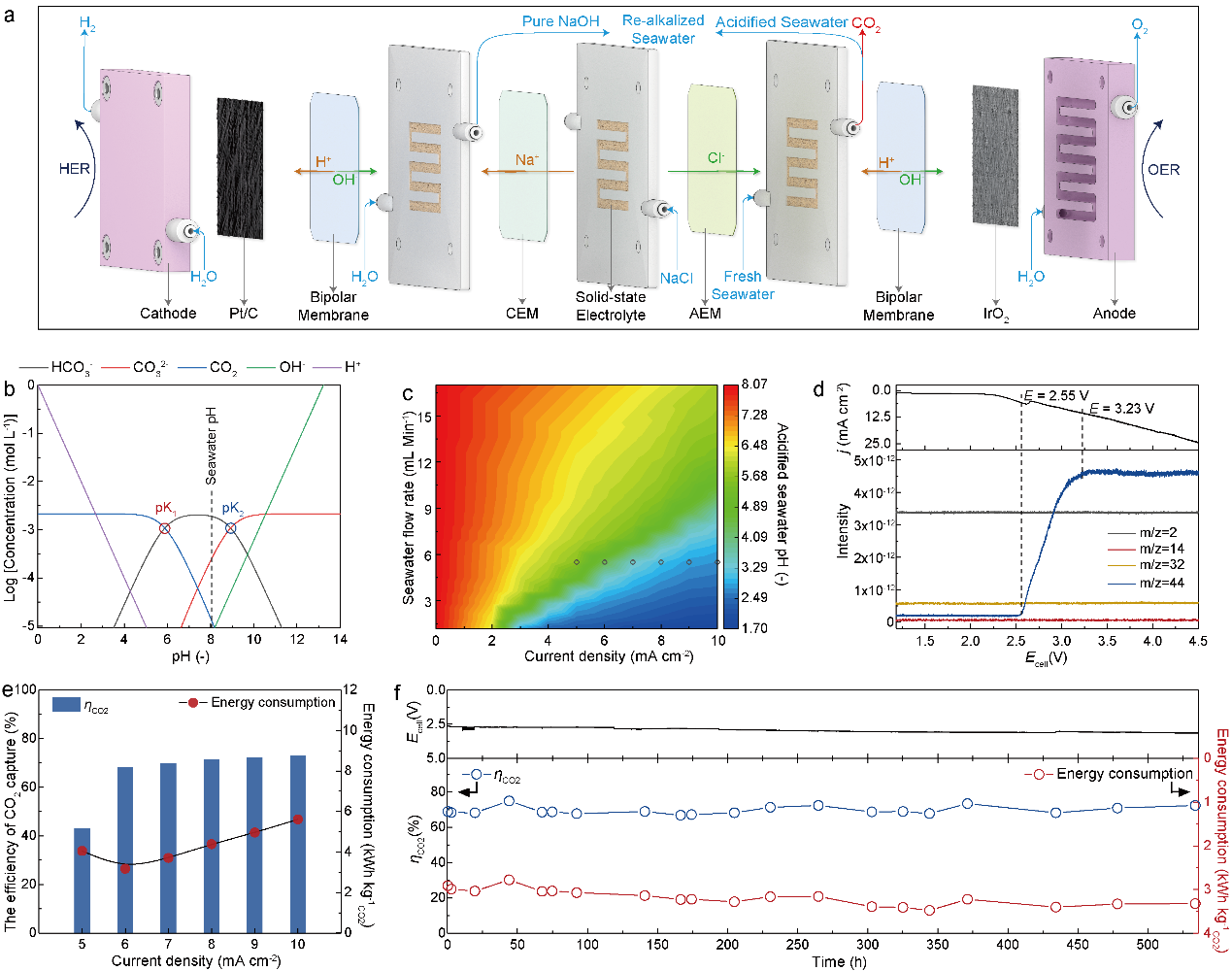 研究团队开发了一种用于海水碳捕集的装置,并在结构设计与运行稳定性方面取得了突破。该装置能够以天然海水为原料实现陆续在二氧化碳捕集,在实际条件下稳定运行超过500小时,显著提升了系统的可靠性。实验结果显示,该装置的碳捕获效率超过70%,并可同步副产氢气;其捕获每吨二氧化碳的成本仅为229.9美元,展现出潜在的经济竞争力。该成果不仅验证了直接利用天然海水实现持续“捕碳”的可行性,也为将海洋碳汇转化为绿色分子与材料、有助于海洋经济开展给予了新的可能性(图2)。
