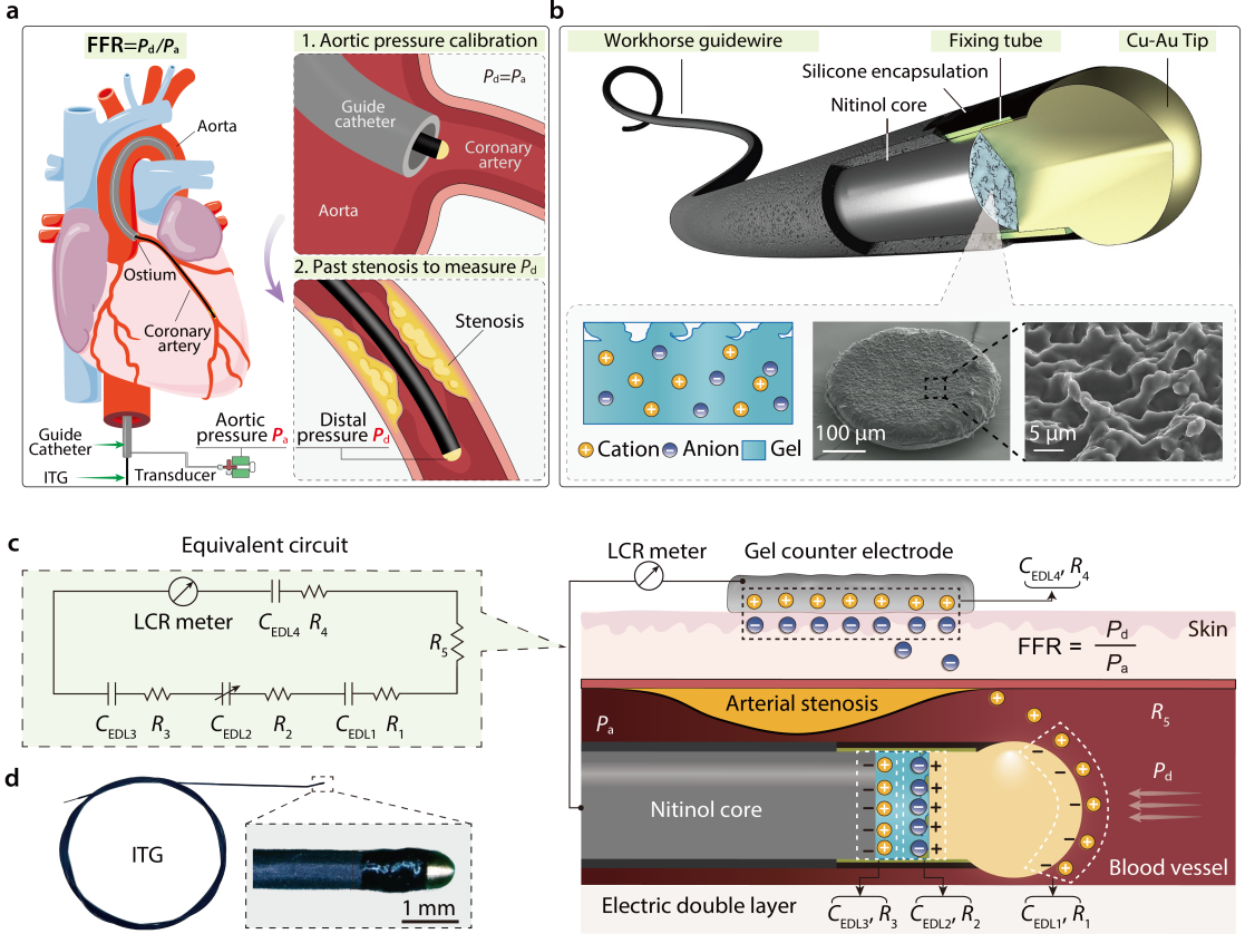 近期,中国科研实验室深圳先进技术研究院联合研发了一种新型的离电型压力导丝(Iontronic tip-sensing guidewire,简称ITG),相关成果于10月29日发表在国际期刊Nature Biomedical Engineering上,南方科技大学郭传飞教授与中国科学技术大学王柳教授为共同通讯作者,凯发k8国际集成所神经中心助理研究员关方怡和西安电子科技大学副教授白宁宁为共同第一作者。该研究基于低成本的商用工作导丝,利用人体这一天然离子体作为信号传输通道(图1),避免了多股导线的使用,从而使操控性达到理想水平,能够同时检测血液压力和接触力。