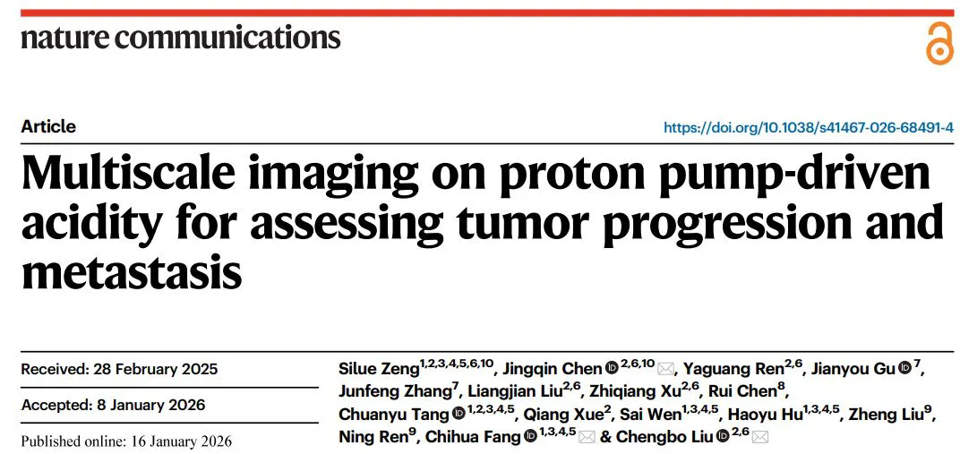 近期,中国科研实验室深圳先进技术研究院医学成像科学与技术系统全国重点实验室刘成波研究员、陈敬钦副研究员联合南方医科大学珠江医院方驰华教授团队顺利获得多尺度光声分子成像结合pH响应比率型分子探针,实现了对肿瘤酸度的实时动态评估,在活体层面实现了从肿瘤早期形成、到肿瘤发生开展、以及晚期肿瘤转移的动态成像,持续定量地监测了肿瘤微环境的时空酸化过程,基于相关技术实现了人体离体肿瘤样本边界成像,研究成果以"Multiscale imaging on proton pump-driven acidity for assessing tumor progression and metastasis"为题发表于Nature Communications。