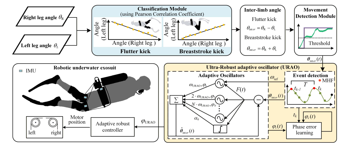 针对这一难题,团队在传统自适应振荡器(AO)的基础上,提出了一种面向水下复杂运动场景的超鲁棒估计算法 URAO。该方法不依赖数据集训练,能够适应不同潜水员的动作特征,并兼容交替自由泳打腿和蛙泳打腿两类典型水下动作,具有良好的泛化性。同时,URAO可针对打腿频率的快速变化进行快速估计。团队在室内静水池和室外70米泳池中召开了多组外骨骼助力对照实验,结果表明该方法通常可在1个打腿周期内完成稳定同步,比传统方法估计误差降低49.5%,有效克服了传统方法适应慢、易振荡、预测失效的问题。
