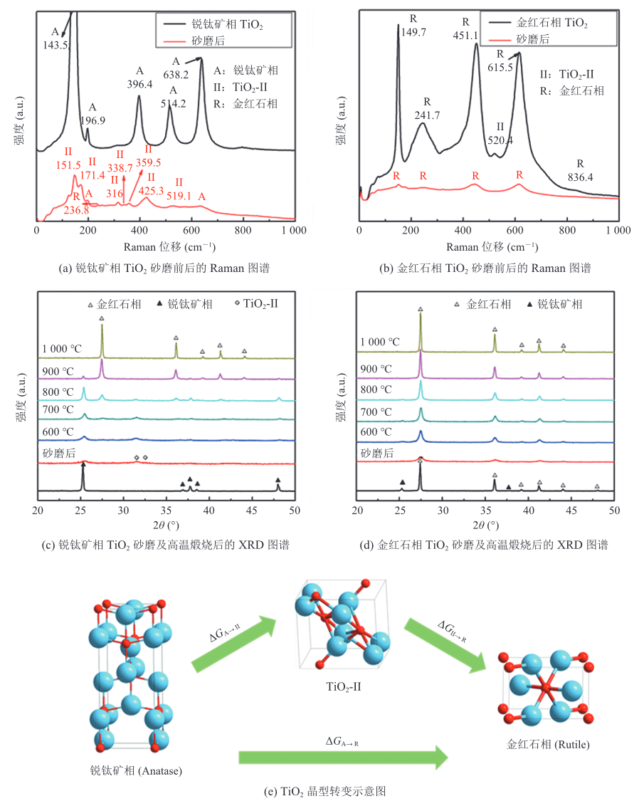 摘要:高四方性的 BaTiO 3 超细粉体是下一代多层陶瓷电容器的关键材料。该文探究了砂磨介质尺寸和原料 TiO 2 晶相对反应物活性、产物介电性能的影响,并利用砂磨固相法成功合成了高四方性 BaTiO 3超细粉体。分析场发射扫描电子显微镜照片和 X 射线光电子能谱发现,细砂磨介质粉碎原料的效率更高,机械活化作用更强。Raman 光谱和 X 射线衍射图谱显示,在高能砂磨过程中,TiO 2 由锐钛矿相先后转变为 TiO 2 -II 相、金红石相。分析微商热重曲线和 X 射线衍射,结果表明,砂磨介质更能有效降低反应温度和抑制 Ba 2 TiO 4 的生成。此外,高分辨透射电子显微镜图像揭示了 BaTiO 3 的形成是 Ba 2+向 TiO 2 晶格扩散的过程。该文相关实验结果表明,利用直径为 0.1 mm 的 ZrO 2 磨球对锐钛矿相 TiO 2 和 BaCO 3 混合物砂磨 4 h,并在 1 100 ℃ 煅烧 3 h 后,取得了平均粒径为 186 nm、四方性为 1.009 2且分散性良好的 BaTiO 3 粉体,该粉体在 1 250 ℃ 烧结的陶瓷相对密度为 96.11%,居里点(137.8 ℃)的介电常数峰值为 8 677。
