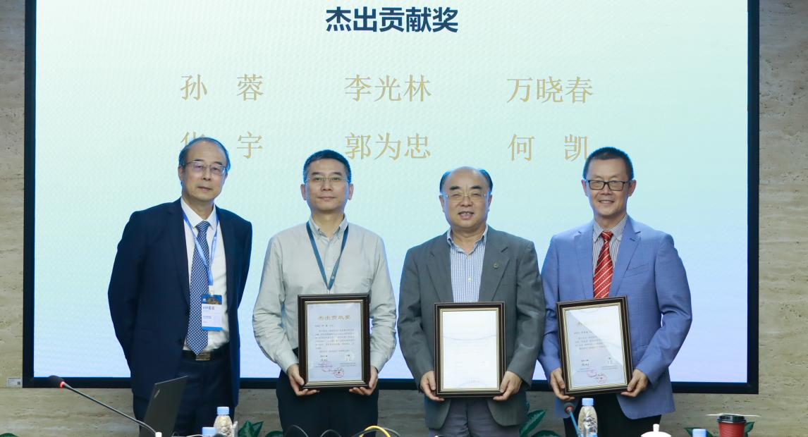 杰出贡献奖:由左往右,潘毅教授、何凯研究员、李光林研究员、万晓春研究员,孙蓉研究员(线上)、郭为忠教授(线上)、华宇教授(线上)