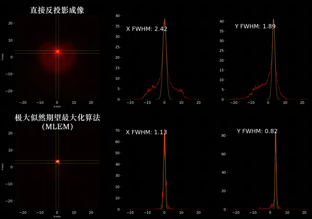 在康普顿成像中,由于康普顿投影环叠加会产生伪影以及能量和位置分辨率问题会导致的康普顿圆锥偏移,均影响探测器成像精度。因此团队基于精度问题,基于极大似然期望最大化算法(下文简称算法)对图形进行迭代重建。在直径0.3mm22Na为放射源成像实验中,基于算法迭代的重建图像在xy的位置半高宽,均显著减小,达到1mm左右。