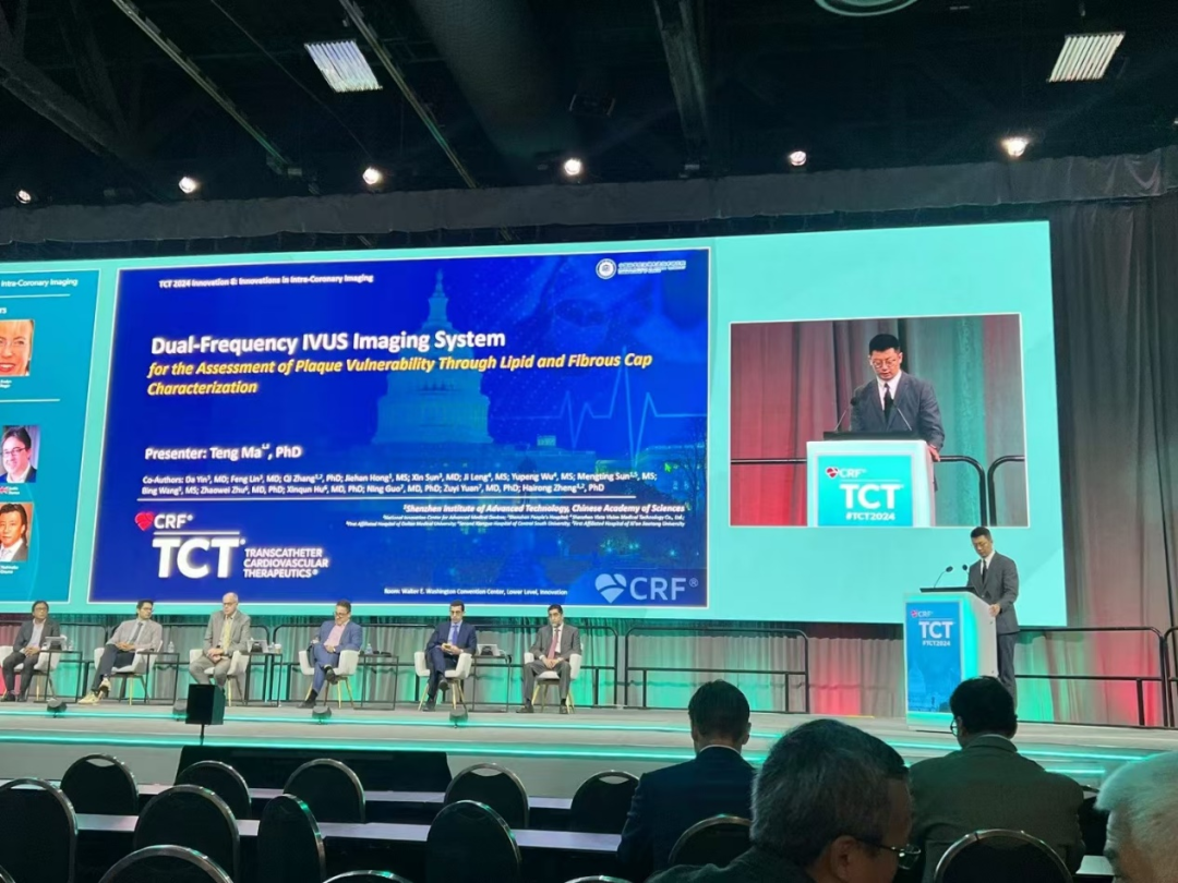 马腾团队的相关临床研究成果受邀在美国经导管心血管治疗学会议(TCT 2024)上作专题报告,取得了全球专家的广泛关注。在第26届中国国际高新技术成果交易会上,马腾团队带来了新一代超高频双频血管内超声(IVUS)成像诊断仪器的最新临床研究成果。