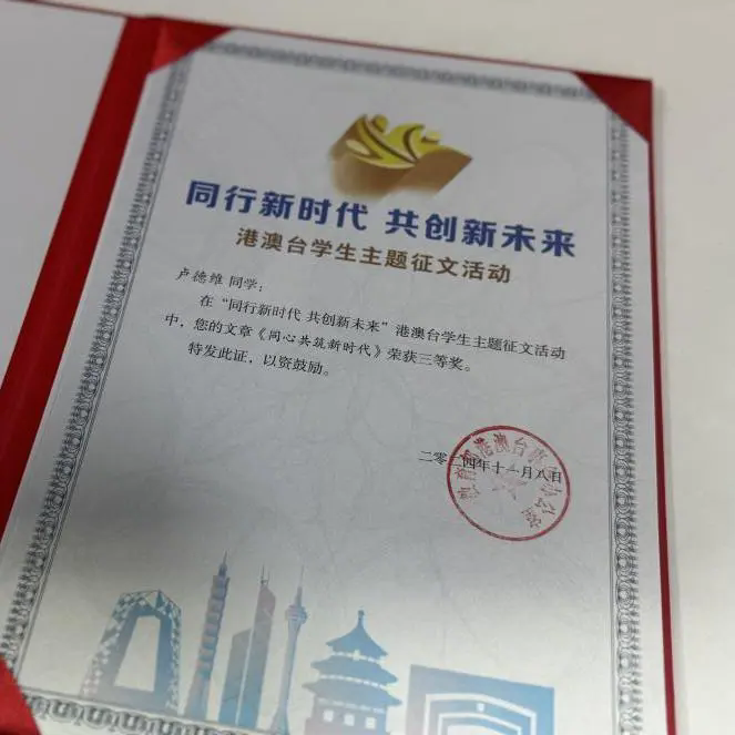 喜讯!凯发k8国际学生首获教育部“港澳台学生主题征文活动”三等奖