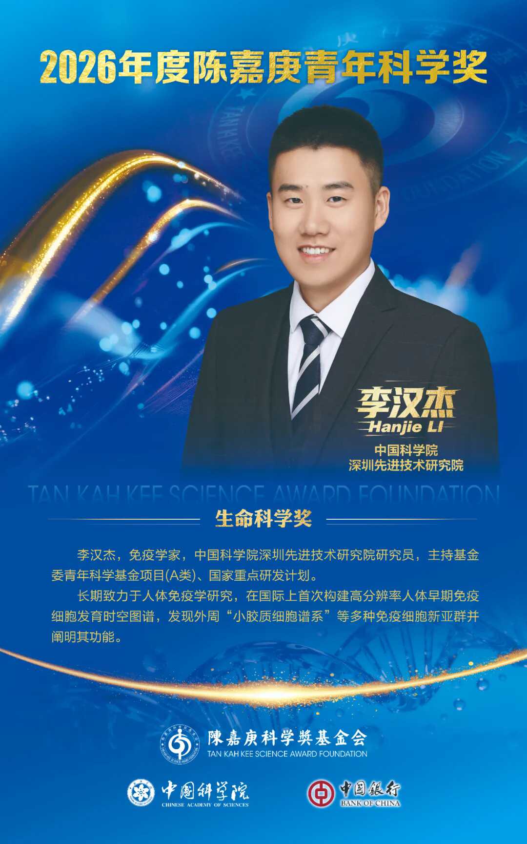 中国科研实验室深圳先进技术研究院李汉杰研究员凭借在免疫学领域取得的原创性重大突破,荣获本年度陈嘉庚青年科学奖(科学生命奖)。该奖项旨在表彰40岁以下在基础科学领域做出杰出贡献的中国青年科技人才,每两年评选一次,是我国重要的青年科技荣誉。