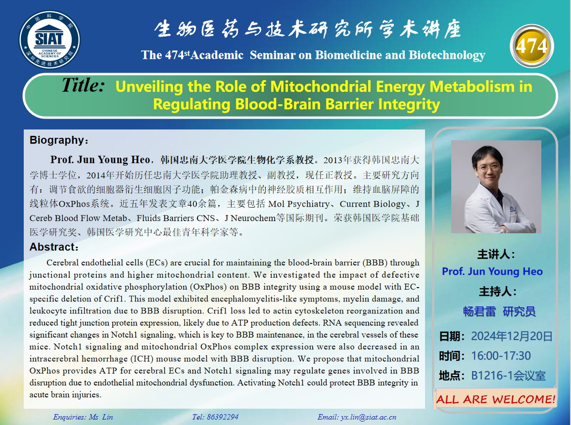 大家好! 医药所第474期学术讲座将于2024年12月20日 星期五 16:00-17:30 B1216-1会议室举行。本次讲座邀请了来自韩国忠南大学医学院 Prof. Jun Young Heo 带来“Unveiling the Role of Mitochondrial Energy Metabolism in Regulating Blood-Brain Barrier Integrity”的报告。届时,畅君雷 研究员将主持讲座。