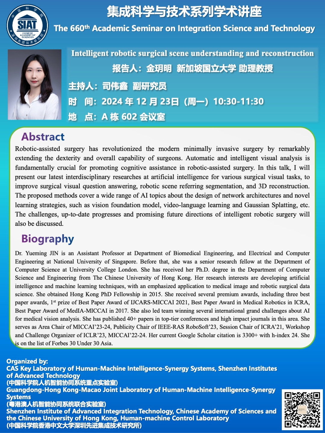 集成所第660期集成科学与技术系列学术讲座将于 2024 年 12 月 23日(周一)10:30-11:30 在  A 栋 602 会议室   召开,次讲座特邀 新加坡国立大学 金玥明 助理教授作题为《Intelligent robotic surgical scene understanding and reconstruction的学术报告。