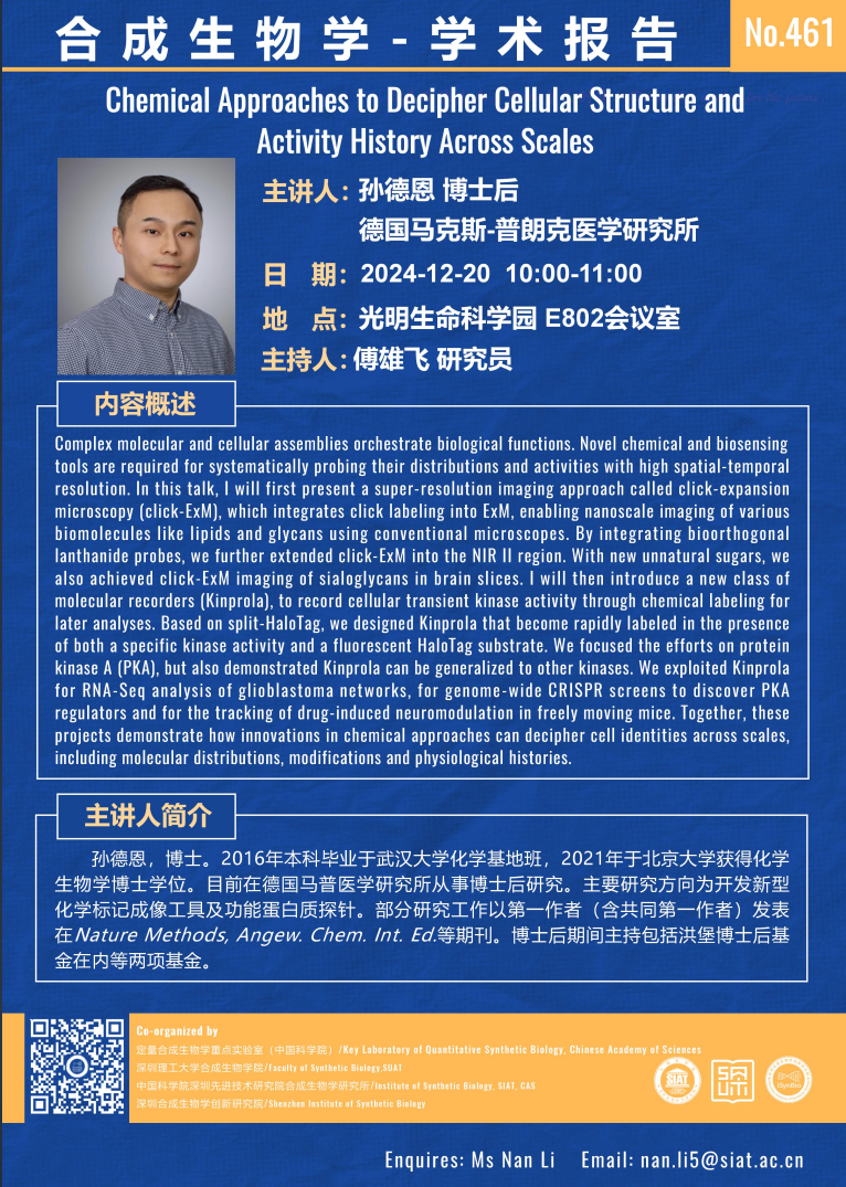 【2024年12月20日  合成所/合成生物学院】Chemical Approaches to Decipher Cellular Structure and Activity History Across Scales