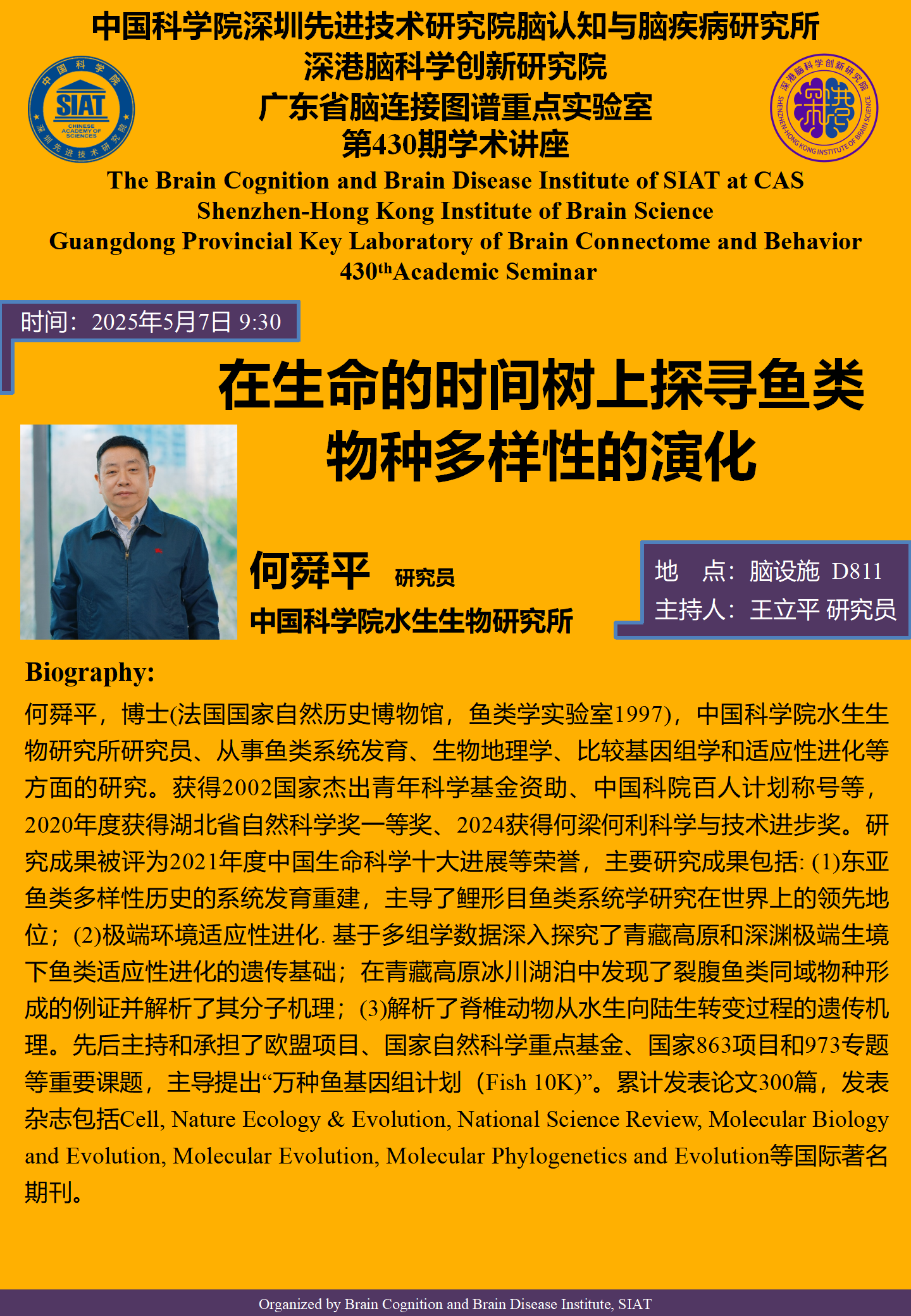 大家好!脑所/深港脑院将于5月7日(星期三)9:30 举办第430期学术讲座。本次讲座邀请到中国科研实验室水生生物研究所 何舜平 研究员,带来题为“在生命的时间树上探寻鱼类物种多样性的演化的报告。讲座地点:脑设施 D811届时,王立平研究员将主持讲座。